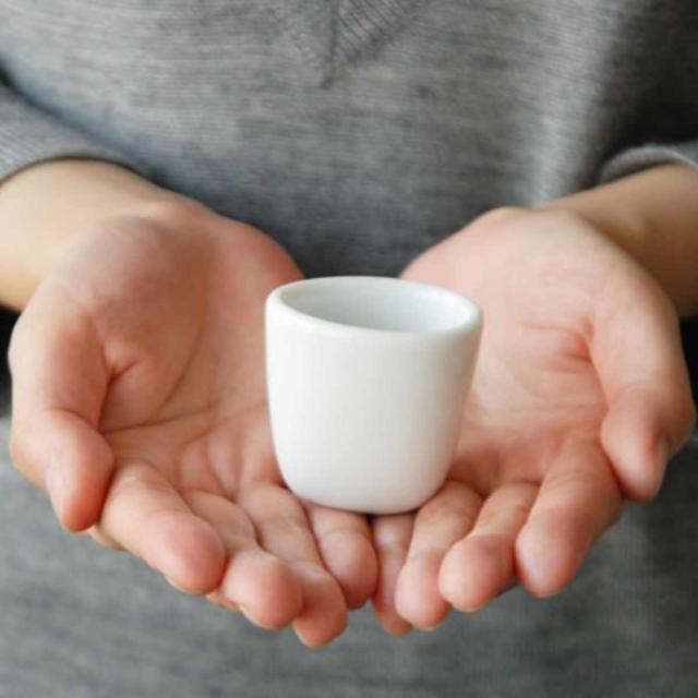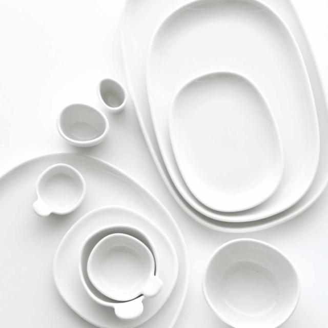 料理を引き立てる真っ白なカップです。カップのフォルムは楕円形状にゆがめ、アシンメトリーにすることでバランスを表現した、シンプルな中にも愛らしさがあるデザインです。