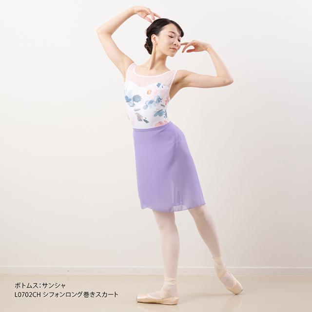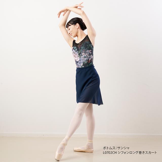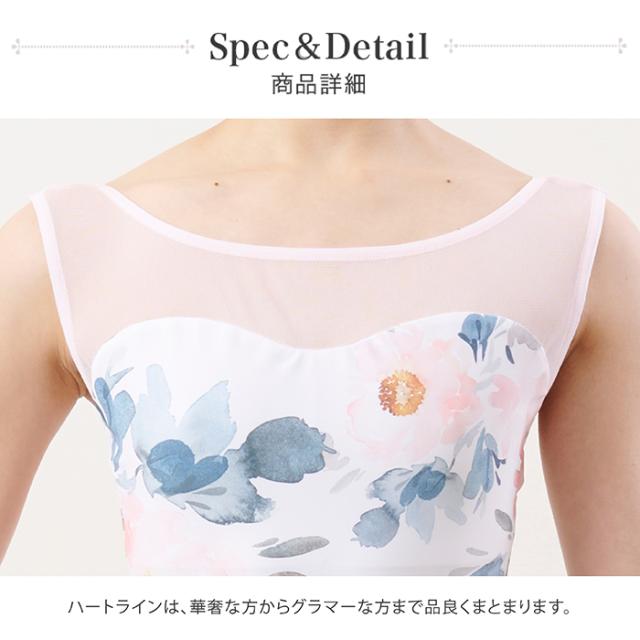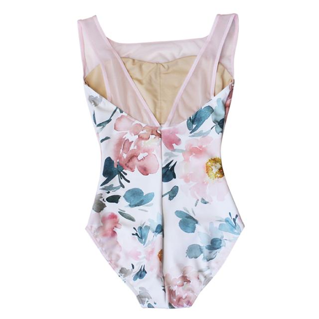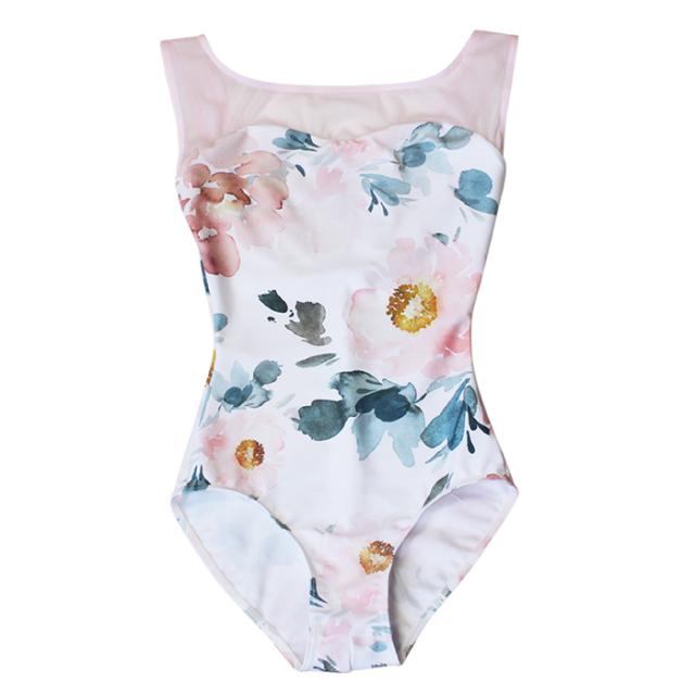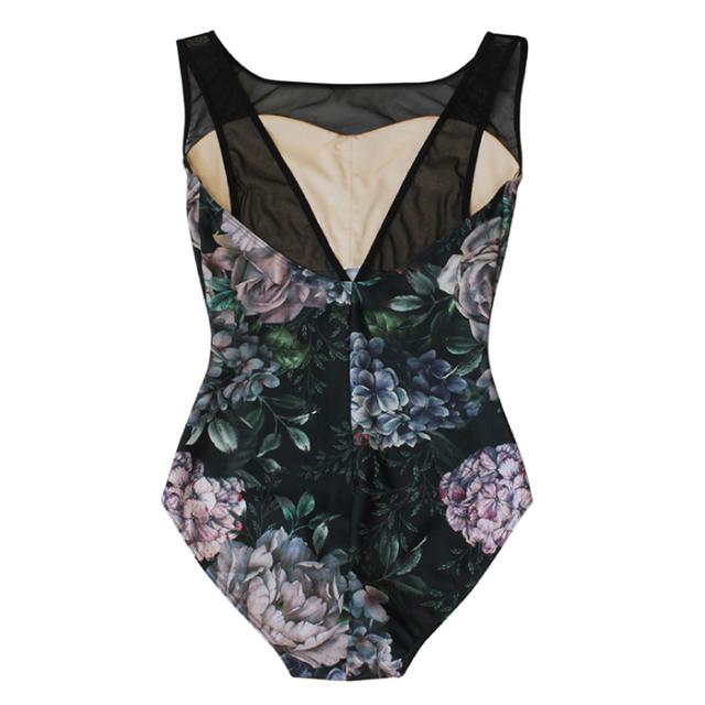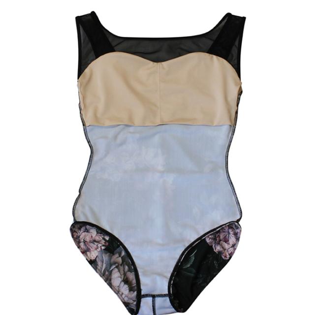 メッシュと花柄が美しいノースリーブレオタードです。