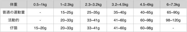 ・給与量は猫種、体質、生活環境、活動量、年齢、季節や気候などにより大きく違ってきます。上記給与目安量を目安として理想的な体重を維持できる最適な量に調整してください。
