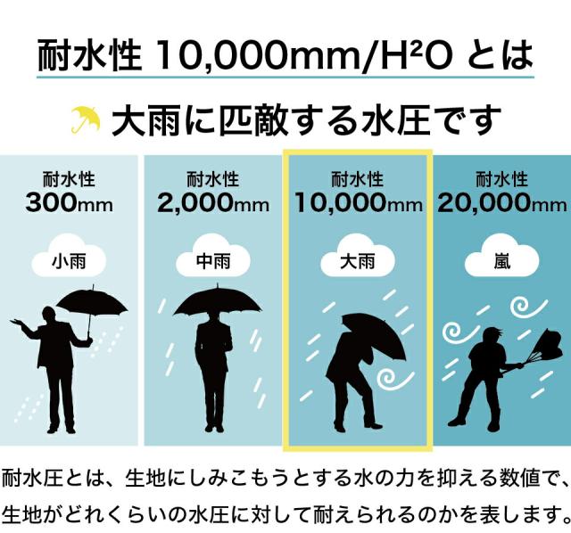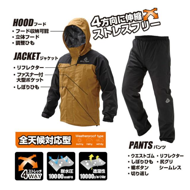 | タテヨコ4方向に伸縮 絶対的ストレッチ。ストレスフリーで体にフィット。 透湿防水シートを採用の全天候対応型なの通気性にも優れ、雨の日以外でもお使いいただけます。 作業用や普段使い、アウトドアなどにも最適です。 ・4方向全てに伸縮するストレスフリーな超軽量ストレッチ透湿レインウェア! ・高い 防水力 耐水圧 10,000mmH2O、透湿度 10,000g/m2-24hr ・上着は、水の侵入を防ぐ前たて、収納可能な立体フード(調整ひも付)、裾部分には絞りヒモ付で下からの雨・風の侵入をブロックします。 ・上着の左右両サイドにファスナー付の大型ポケット付(開口部最大26.5cm) ・パンツの裾部分ワンタッチボタンで、フィット感を調整可能。 ・ヒップ部分には縫目のないシームレス設計を採用で履き心地を向上。 ・ウエスト部分はゴムと絞りヒモで、脱ぎ履きしやすい! ・反射ロゴプリントを上着の左胸部分、背面右上部とパンツの左膝部分に配置し、夜の安全も確保! ・縫製部分の裏面には防水テープ(シームテープ加工 )で水の侵入を防ぎます。 ・上下セット。 |