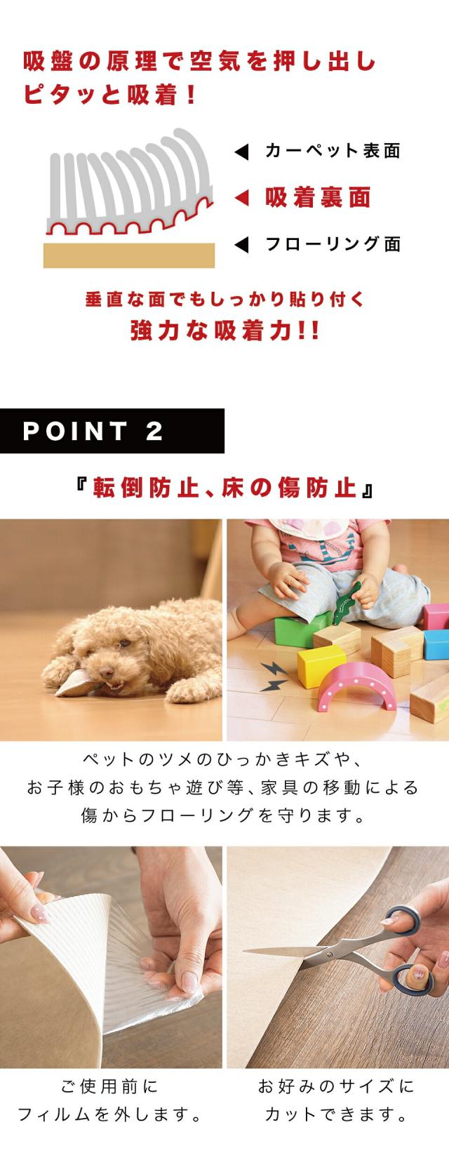 ■商品説明 裏面は特殊吸着加工で床にピタッと吸着。 簡単に外せて跡も残りません。 ロールタイプで好きな大きさでカットできます。 目に見えない無数の気孔があり上から力が加わると空気が抜けて真空状態になります。 それが無数の吸盤となり、くっつく仕組みです。 吸盤の様にピッタリ貼り付き、掃除機で吸い込んでも、犬が走り回ってもめくれず、つまづきにくく安全です。 床にキズがつきにくく、掃除もラクラク。 薄型なので、バリアフリーの床と扉の隙間に収まり、扉に干渉しません。 汚れても洗える。ウォッシャブル仕様 安心の品質 日本製です。 ※床暖房には対応しておりませんのでご了承ください。 |