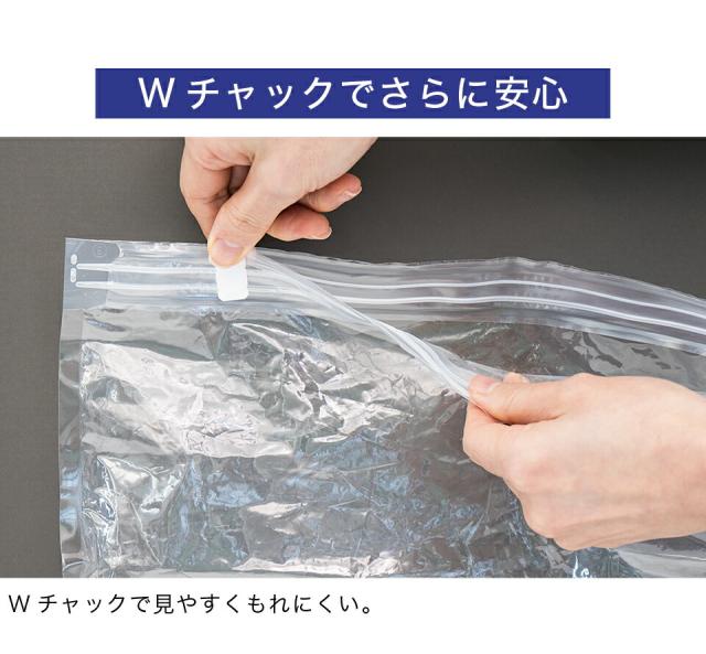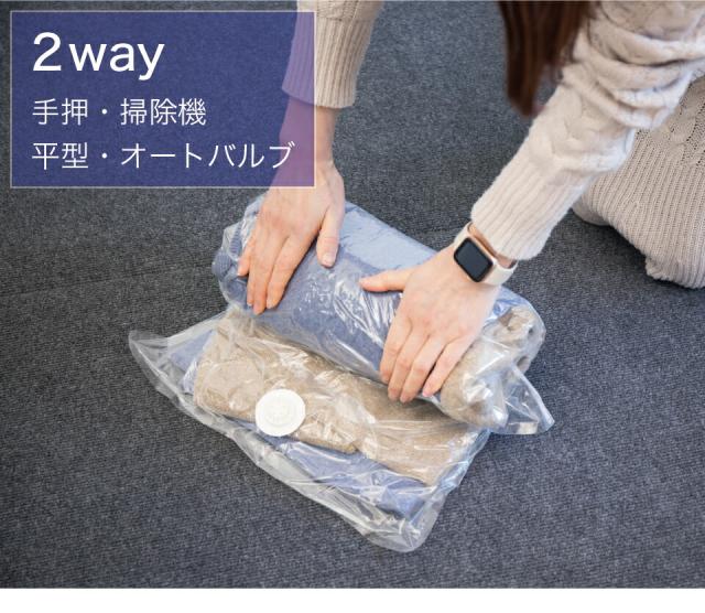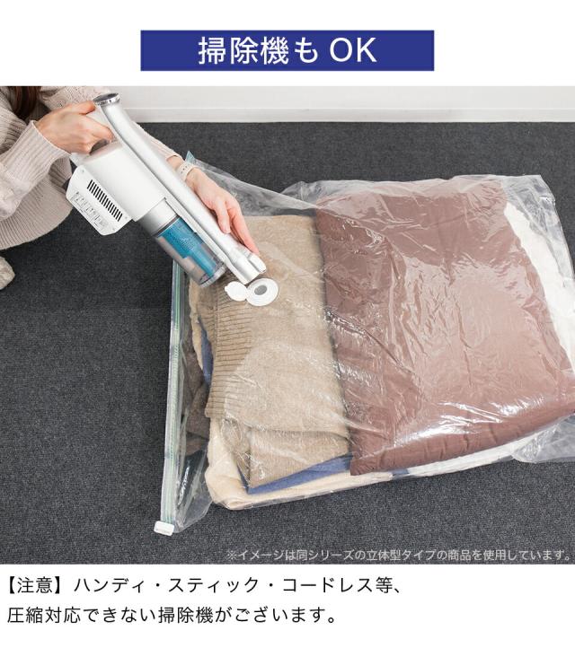 ■2WAYバルブ 衣類圧縮袋 10枚組 Mサイズ 空気が逆戻りしない逆止弁、オートロックバルブ採用でバルブ開閉の手間が不要です。 掃除機を使わない手押し圧縮、掃除機を使った吸引圧縮、どちらの使い方も可能です。 ※掃除機のノズル先端がフラットでないタイプや、吸引力が小さい機種はご使用なれません。(先端適応内径約30〜50mm) キャリーケースやスーツケースにもピッタリ。 3〜4日の出張、旅行等にもコンパクトにスペース有効。 衣装ケースの衣類の収納整理にも便利な大きさです。 収納の目安/セーター、トレーナーなど(大きさ、厚みにより異なります) Mサイズ:1〜2枚 Lサイズ:1〜3枚 LLサイズ:1〜5枚 |
