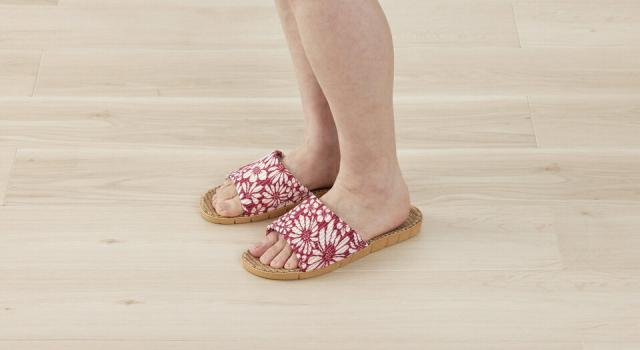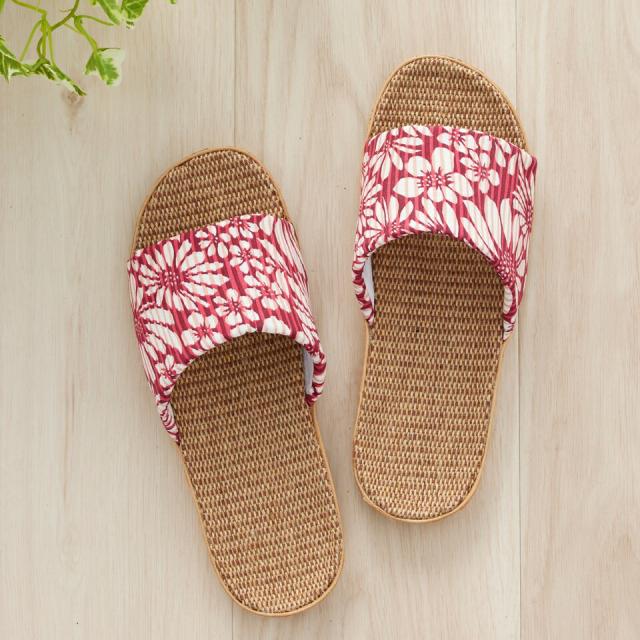 甲に爽やかな花柄生地をあしらったジュートスリッパ
