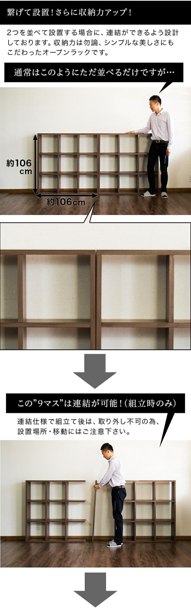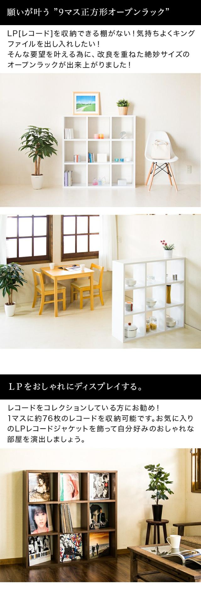 ■商品番号SNG1044139商品説明正方形 オープンラック LEDライト付きライトアップで輝くコレクションLP[レコード]を収納できる棚がない!気持ちよくキングファイルを出し入れしたい!そんな要望を叶える為に、改良を重ねた絶妙サイズのオープンラックが出来上がりました!内側約32×32cmの”正方形”充実空間。DVD・コミック・文庫本は勿論、レコードやオブジェ 食器などをディスプレイして魅せる収納を楽しめます。A4サイズのキングファイルが 収納できます。オフィスや書斎用 本棚として書類の保管に最適なシェルフです。 隙間があるので出し入れも楽にできます。ファッションや趣味の雑誌も余裕で収納!お気に入りの本・雑貨をディスプレイできます。バッグや帽子などがショップのようにオシャレに片付く! 普段使いのカバンがさっと出し入れ出来ます。少年コミックや文庫は前後2列に置けます。1マスに約40冊収納可能です。壁面ユニットシェルフ おしゃれなリビングを演出する間仕切りシェルフ 連結シェルフ 多目的ラック ディスプレイ棚 木製 A4本棚 オフィス書棚 事務用シェルフ リビング本棚 おしゃれな間仕切り本棚 間仕切りとしてオシャレな棚 LPレコードがピッタリ入る、オープンシェルフ。ディスプレイ収納も大容量で雑誌や書類などの書棚として。北欧風デザインの本棚。連結ユニット可能ラック。 間仕切り正方形ラック、幅106cm高さ106cmのスクエアラック、ディスプレイラックとしての利用がオシャレな本棚。シンメトリーなデザインが美しいシェルフ。A4サイズの書類やファイルの書棚、LPレコードも入るのでリビングでレコードラックに最適。送料無料 オープンラック 連結 おしゃれ 北欧 ウォールナット ディスプレイラック 本棚 LP盤 CD DVD リビング オーディオルーム コレクションラック レコード 子供 アイランド ロータイプ ソファ 後ろ 棚 薄型 雑誌 カフェ フリーラック 書棚 スクエア 西海岸風 ワンルーム お店 窓下収納 シューズボックス 多目的ラック 連結ディスプレイラック 本棚 オープンラック 間仕切り 棚 飾り棚 正方形ラック デザイン本棚 オープンシェルフ レコードラック リビングラック リビングシェルフ ディスプレイラック 間仕切り 106×106cm ホワイト/ウォールナット 木製 スクエア 奥行26 高さ106 オープンラック 本棚 3段 3列 A4ファイル LPレコード LP収納 ディスプレイ 正方形 本棚 シェルフ オフィス 書棚 リビング 本棚 おしゃれ 本棚/通販/送料無料 新生活 シューズインクローゼット シューズインクローク シューズクローク ウォークインシューズクローク シューズ・イン・クローク 格子型 ラック シェルフ グリッド オープンシェルフ 本棚 部屋の仕切り 本棚 部屋の真ん中 本棚 服 収納 本棚 風水 本棚 掃除しやすい 飾り棚 四角 飾れる 漫画喫茶 まんが喫茶 マンガ喫茶 図書館 漫画図書館 まんが図書館 マンガ図書館 コレクション コレクター グッズ グッズ収納 フィギュア おもちゃ オモチャ 玩具 写真集 画集 イラスト集 B5 B6 A5 A6 週刊誌 マガジン 絵本 絵本棚 ランドセルラック 教科書 幅106cm 幅100cmから幅110cmのラックが必要なら オープンラック おしゃれ リビング収納 オフィス 収納スペース幅32cm 収納スペース幅30cmから幅35cmの間仕切りラックをお探しなら 収納スペース高さ32cm 収納スペース高さ30cmから高さ35cmのラックを探している方に、収納スペース約35×35cm約30cm×30cmの間仕切りラックで色々なものが飾れる 2台セットなので単品よりも お得 商品番号sng1044139商品説明連結して設置できる、おしゃれな本棚2台セットです。LP[レコード]を収納できる棚がない!気持ちよくキングファイルを出し入れしたい!そんな要望を叶える為に、改良を重ねた絶妙サイズのオープンラックが出来上がりました!内側約32cm×32cmの”正方形”充実空間。1マス約幅32cm×高さ32cm×奥行26cmの大きさで 充実の収納力! DVD・コミック・文庫本は勿論、レコードやオブジェ 食器などをディスプレイして魅せる収納を楽しめます。A4サイズのキングファイルが 収納できます。オフィスや書斎用 本棚として書類の保管に最適。 隙間があるので出し入れも楽にできます。ファッションや趣味の雑誌も余裕で収納!お気に入りの本・雑貨をディスプレイできます。バッグや帽子などがショップのようにオシャレに片付く! 普段使いのカバンがさっと出し入れ出来ます。少年コミックや文庫は前後2列に置けます。1マスに約40冊収納可能です。壁面ユニットシェルフ スタッキングシェルフ 正方形ラック2台セット、幅106cm高さ106cmのスクエアラック、正方形の美しいオープンラック。リビングで間仕切り収納としてオシャレな本棚ユニット 書斎やオフィスでLPレコードやA4ファイルの収納に最適なシェルフ 送料無料 約 高さ100cm 200cm オシャレな正方形のシェルフ 間仕切りオープン本棚 リビングを彩る間仕切り収納 レイアウト自由なユニット本棚 LPレコードやA4ファイルの収納にも正方形ラック 北欧シンプル オープンラック 連結 おしゃれ 