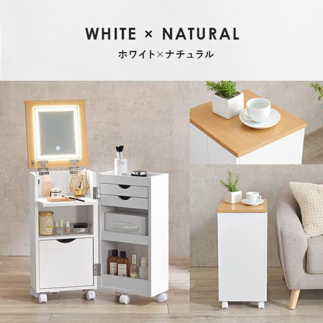 メイクの時だけサッと広げて、普段はコンパクトなサイズ感なのでリビングにも置きやすい大容量収納コスメワゴン。LEDの女優ライト付き