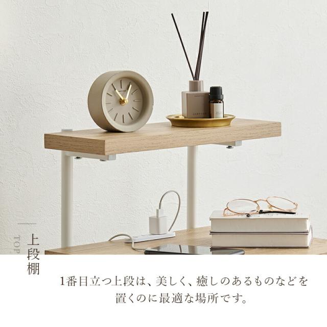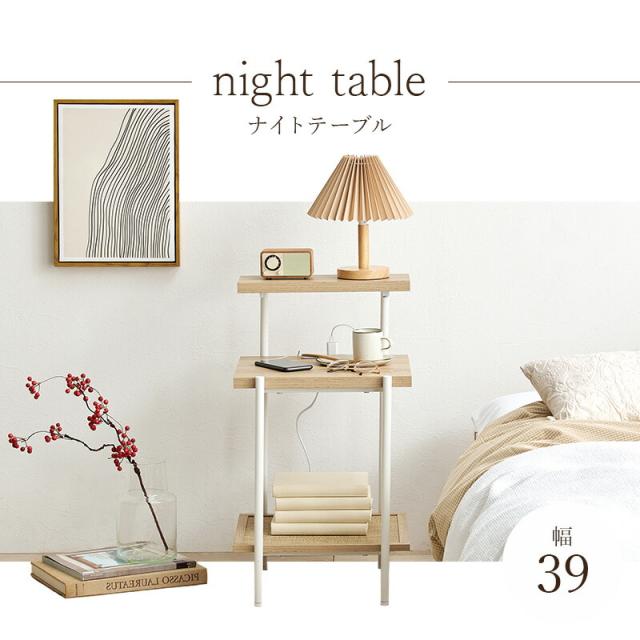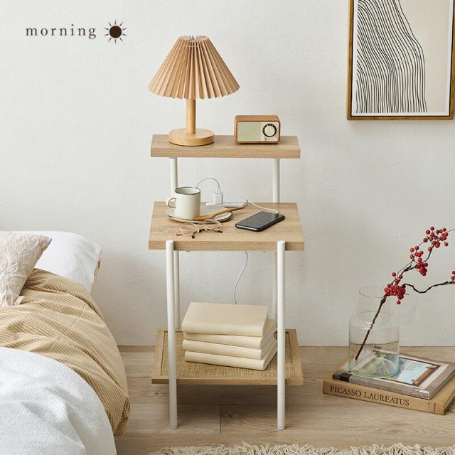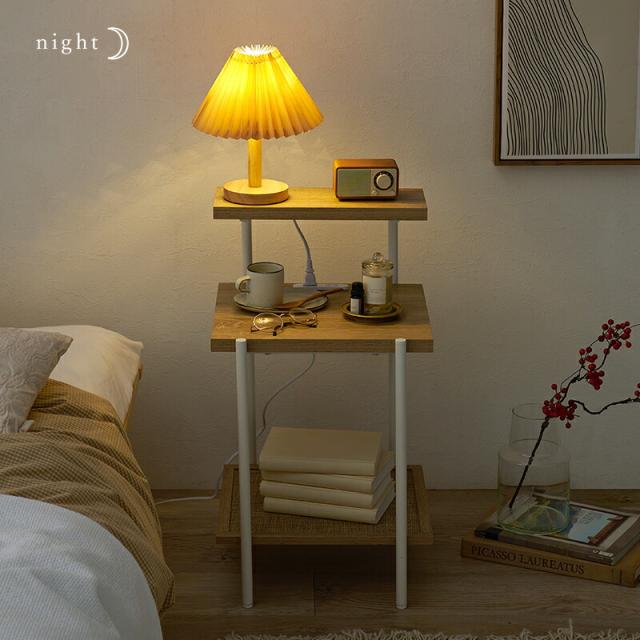 ラタン調の編み目で仕上げた棚板がアクセントとなり、おしゃれなナイトテーブル。2口コンセント付きでスマートフォンの充電やライトなどを置いて使用できます。
