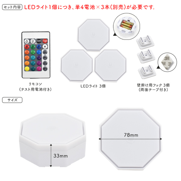 インテリアライト 【八角形】 LEDライト 3個セット 壁掛け式 おしゃれ ライト 乾電池式 リモコン操作 カスタマイズ可 おしゃれ部屋 新生活 間接照明 カラフル ゲーミングライト ゲーミングルーム 照明 きらきら 幻想的 寝室 リビング 子ども部屋 ゲーム部屋 装飾
