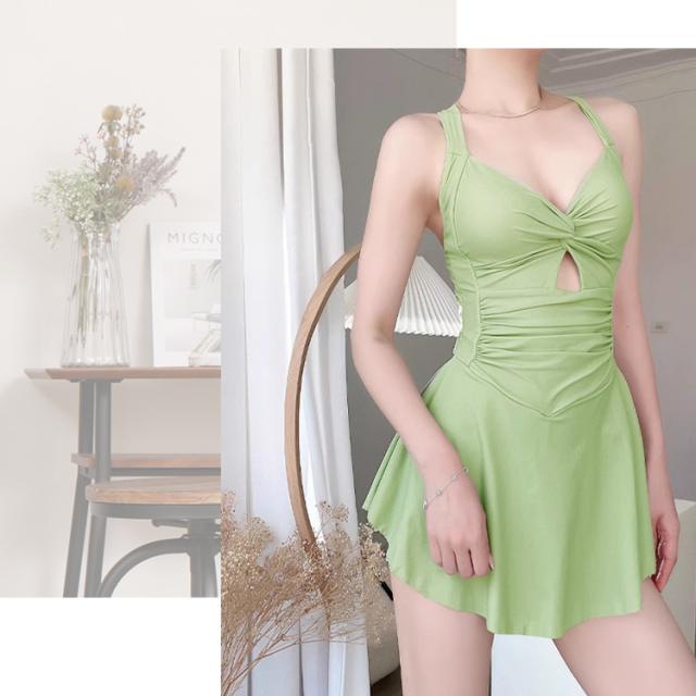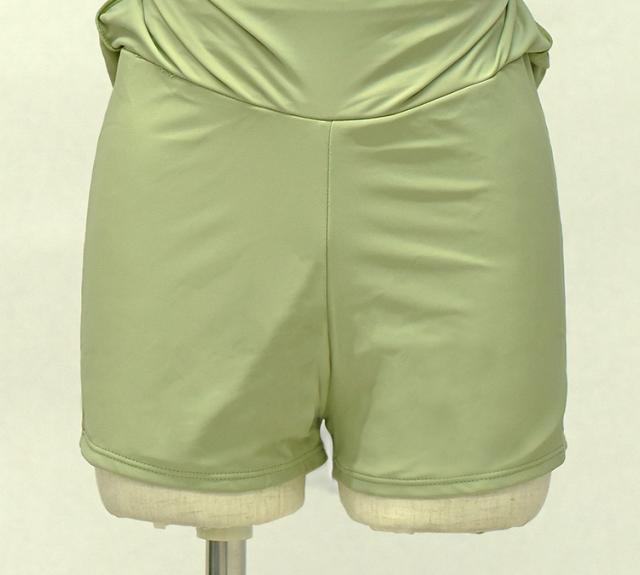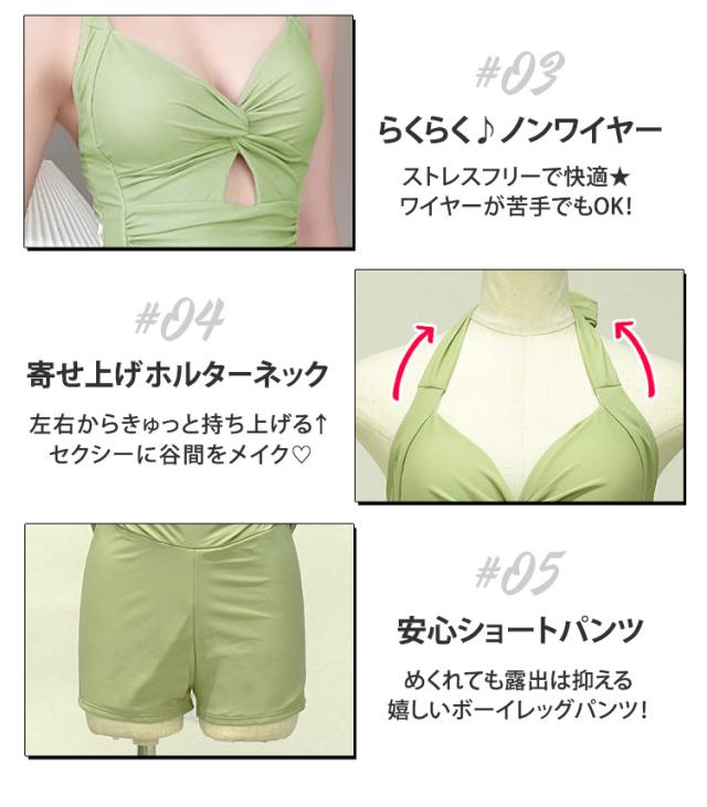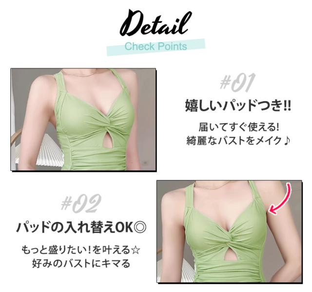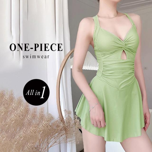 春新作 水着 レディース ワンピース 体型カバー オールインワン おしゃれ かわいい 袖なし ツイストデザイン フレア 胸元 カットアウト ドレープ バックリボン バックシャン ノンワイヤー パッド付き ウエスト ヒップ 太もも カバーアップ スカートの下 ショートパンツ