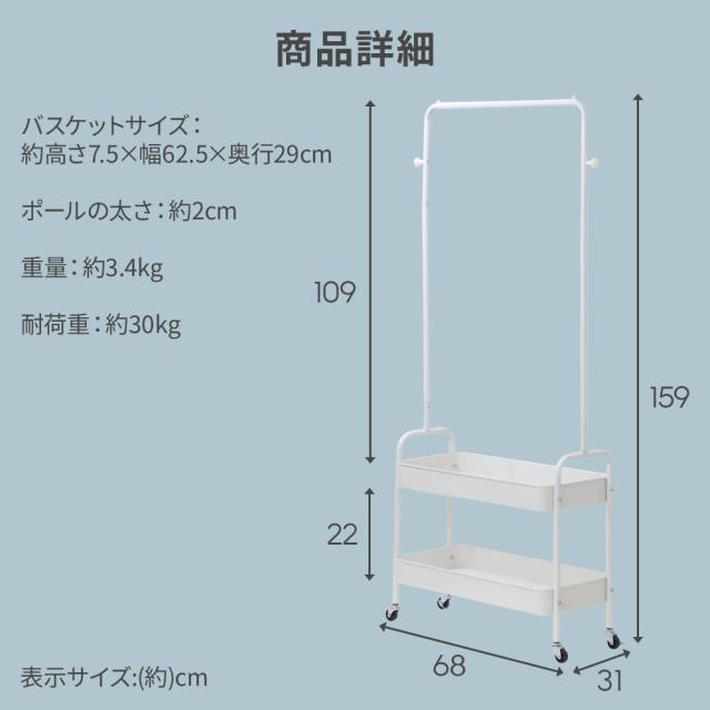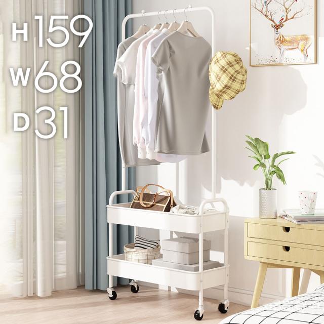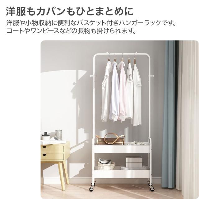 ハンガーラック スリム ハンガーワゴン 幅68cm 省スペース 2段バスケット キャスター付き 戸ローリーハンガー おしゃれ 洋服ラック ランドセルラック 洋服収納 コートハンガー 洋服 雑貨 収納ラック トローリー シンプル 衣類 小物 収納 鞄 コート 整理 ラック コート掛け