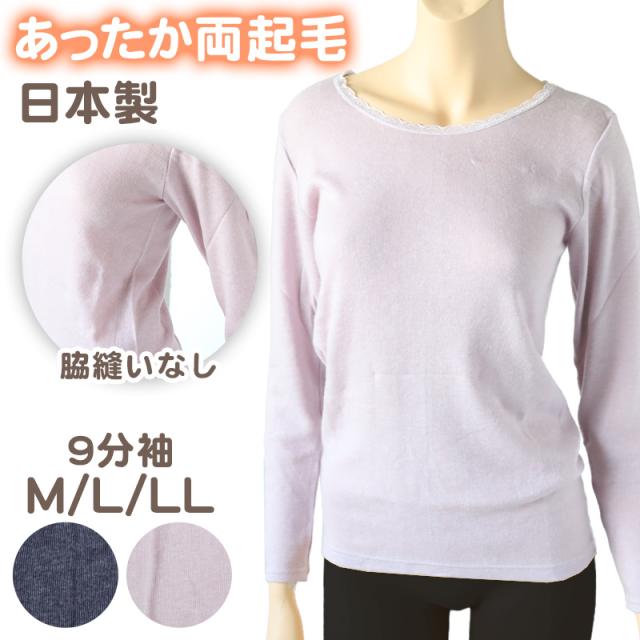 レディース 肌着 インナー 9分袖 丸首 婦人 無地 両起毛 日本製 M L LL 裏起毛 あったかインナー 起毛 暖かい やわらか 防寒 冷えとり 冬 アンダーウェア