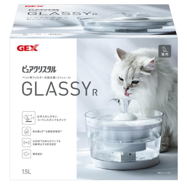 GEX ピュアクリスタル グラッシー R 1.5L 猫用 自動給水器 獣医師推奨 USB電源 フィルター式 循環式 給水器 クリア 透明 グラッシーR ジェックス