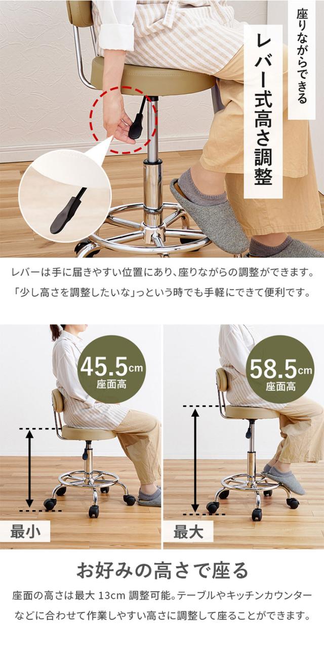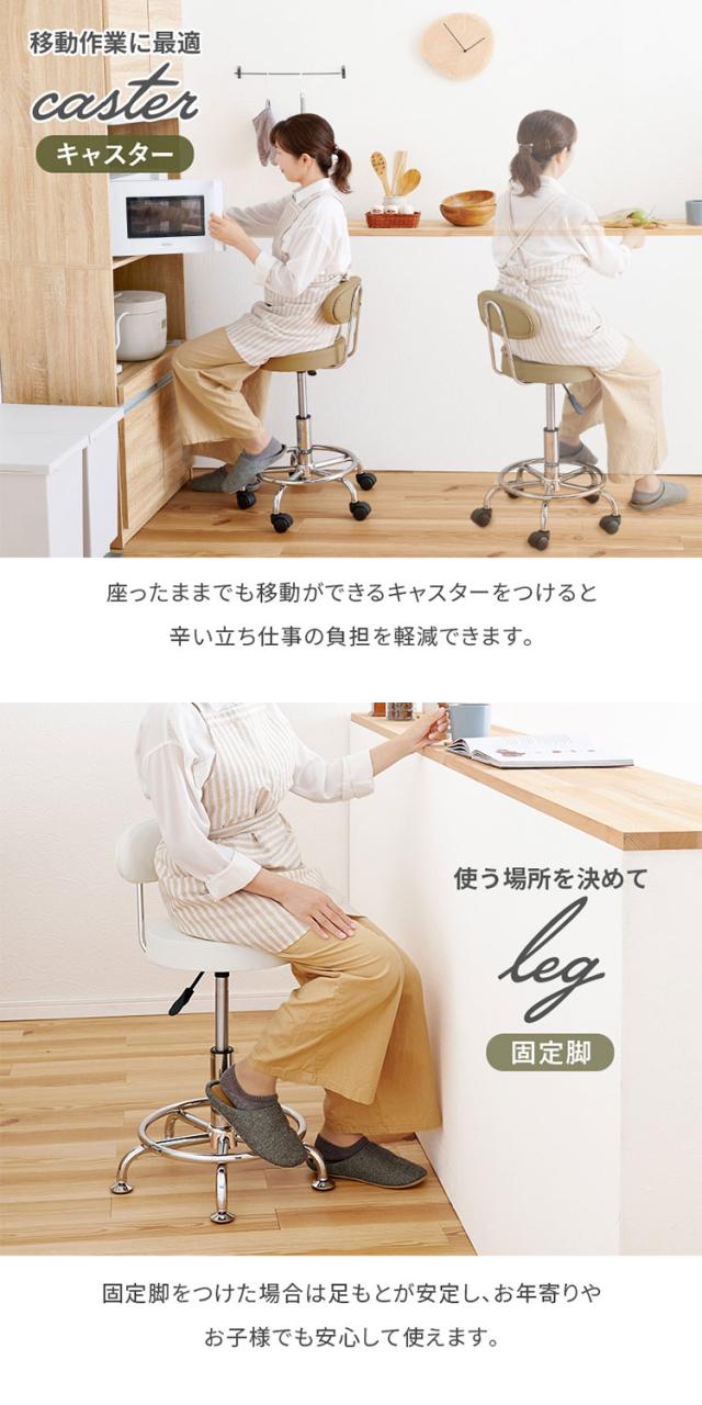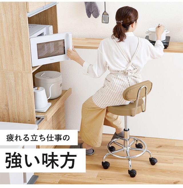 立ち仕事の強い味方。キャスター付きで移動がしやすく、テーブルやキッチンカウンターに合わせて作業しやすい高さに調節可能です。