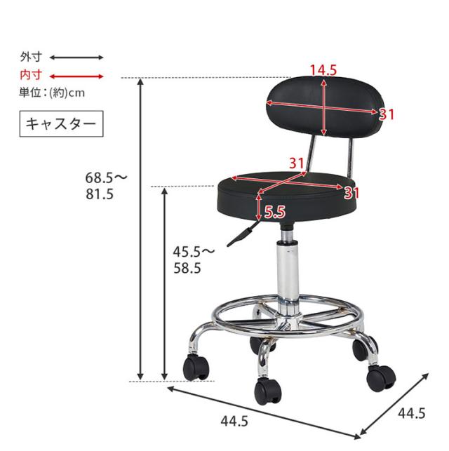 キャスター時:(約)幅44.5×奥行44.5×高さ68.5〜81.5×座面高45.5〜58.5cm