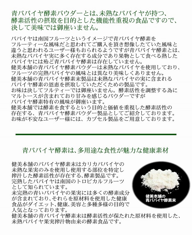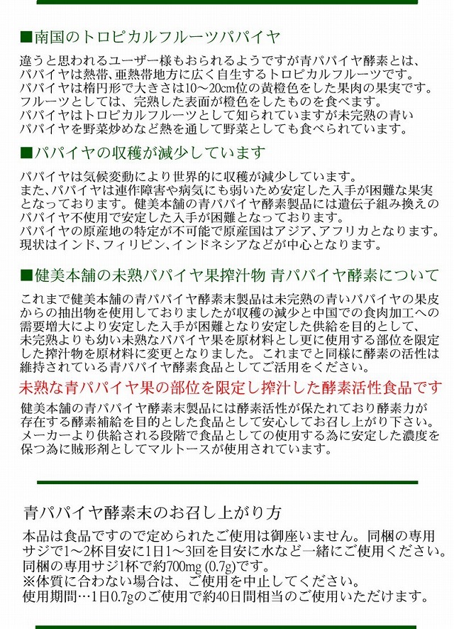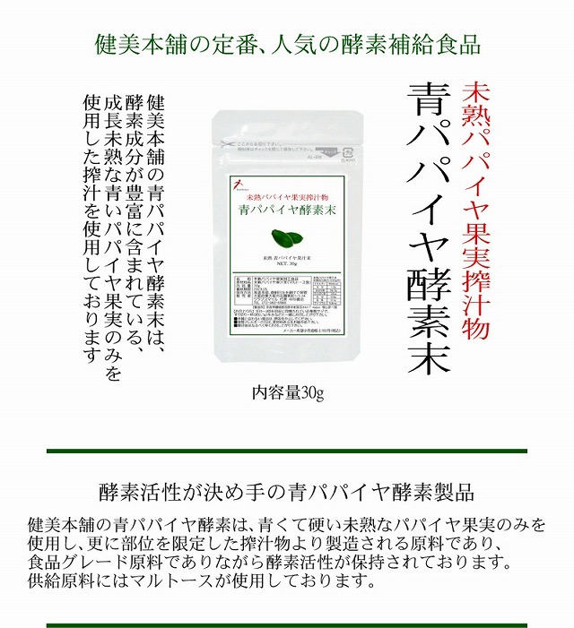 健美食品 酵素活性が決め手の青パパイヤ酵素製品 健美本舗の青パパイヤ酵素は、青くて硬い未熟なパパイヤ果実のみを使用し、更に部位を限定した搾汁物より製造される原料であり、食品グレード原料でありながら酵素活性が保持されております。 供給原料にはマルトースが使用しております。 青パパイヤ酵素パウダーとは、未熟なパパイヤが持つ、酵素活性の摂取を目的とした機能性重視の食品ですので、決して美味では御座いません パパイヤは南国フルーツというイメージで青パパイヤ酵素をフルーティーな風味だと思われてご購入を頂き想像したていた風味と違うと思われるユーザー様もおられるようですが青パパイヤ酵素とは、未熟なパパイヤ実に多く存在する成分であり果物として食べる熟したパパイヤには殆ど青パパイヤ酵素は存在していません。健美本舗の青パパイヤ酵素パウダーは未熟なパパイヤを使用しており、フルーツの完熟パパイヤの風味とは異なり美味しくありません。健美本舗の青パパイヤ酵素末製品は未熟なパパイヤの実に含まれるパパイヤ酵素の恩恵を摂取していただくための製品です。 お味は決してフルティーでは御座いません。酵素活性を調整する為にマルトースが含まれており甘みを感じるパウダーですがパパイヤ酵素特有の風味が御座います。健美本舗では酵素を食するという目的と価値を重視した酵素活性の存在する、青パパイヤ酵素パウダー製品としてご紹介しております。お味が不安なユーザー様には、カプセル製品をご用意しております。 青パパイヤ酵素は、多用途な食性が魅力な健康素材 健美本舗のパパイヤ酵素末はカリカパパイヤの未熟な果実のみを使用し使用する部位を特定し搾汁した酵素活性が存在する、酵素製品です。完熟したパパイヤは南国のトロピカルフルーツとして知られています。未完熟の青いパパイヤの果実には多くの酵素成分が含まれており、それらを原材料を使用した健康食品がダイエット、健康、美容と多種多様の目的で人気となっております。 健美本舗の青パパイヤ酵素末は酵素活性が保たれた原材料を使用した、未熟パパイヤ果実搾汁物由来の酵素食品です。 ●南国のトロピカルフルーツパパイヤ 違うと思われるユーザー様もおられるようですが青パパイヤ酵素とは、パパイヤは熱帯、亜熱帯地方に広く自生するトロピカルフルーツです。パパイヤは楕円形で大きさは10〜20cm位の黄橙色をした果肉の果実です。フルーツとしては、完熟した表面が橙色をしたものを食べます。パパイヤはトロピカルフルーツとして知られていますが未完熟の青いパパイヤを野菜炒めなど熱を通して野菜としても食べられています。 ●パパイヤの収穫が減少しています パパイヤは気候変動により世界的に収穫が減少しています。また、パパイヤは連作障害や病気にも弱いため安定した入手が困難な果実となっております。健美本舗の青パパイヤ酵素製品には遺伝子組み換えのパパイヤ不使用で安定した入手が困難となっております。パパイヤの原産地の特定が不可能で原産国はアジア、アフリカとなります。現状はインド、フィリピン、インドネシアなどが中心となります。 ●健美本舗の未熟パパイヤ果搾汁物 青パパイヤ酵素について これまで健美本舗の青パパイヤ酵素末製品は未完熟の青いパパイヤの果皮からの抽出物を使用しておりましたが収穫の減少と中国での食肉加工への需要増大により安定した入手が困難となり安定した供給を目的として、未完熟よりも幼い未熟なパパイヤ果を原材料とし更に使用する部位を限定した搾汁物を原材料に変更となりました。これまでと同様に酵素の活性は維持されている青パパイヤ酵素食品としてご活用をください。 未熟な青パパイヤ果の部位を限定し搾汁した酵素活性食品です 健美本舗の青パパイヤ酵素末製品には酵素活性が保たれており酵素力が存在する酵素補給を目的とした食品として安心してお召し上がり下さい。メーカーより供給される段階で食品としての使用する為に安定した濃度を保つ為に賊形剤としてマルトースが使用されています。 |