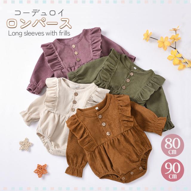 【おしゃれなコーデュロイ素材】ロンパース 女の子 秋冬 春 ベビー 長袖 おしゃれ 服 ベビー服 かわいい フリル コーデュロイ コットン 綿 出産祝い ギフト プレゼント お出かけ 普段着 80 90