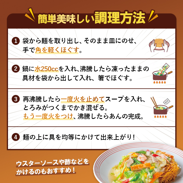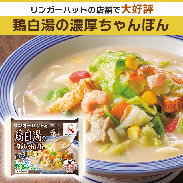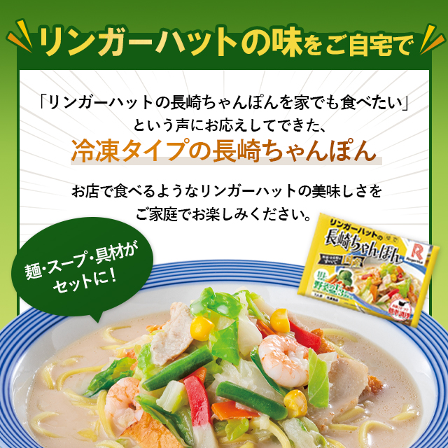 ・厳選素材を使って店舗の味を再現し、自宅にいながらリンガーハットの味を堪能できます。