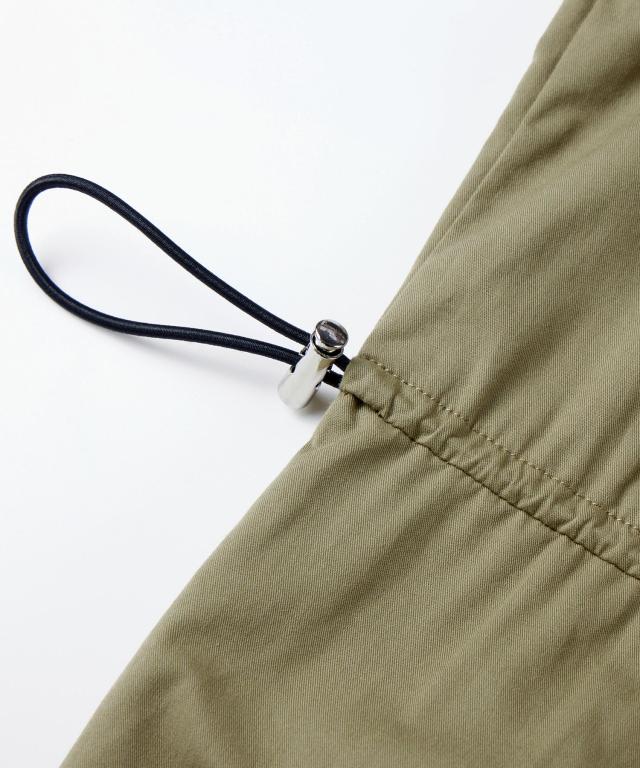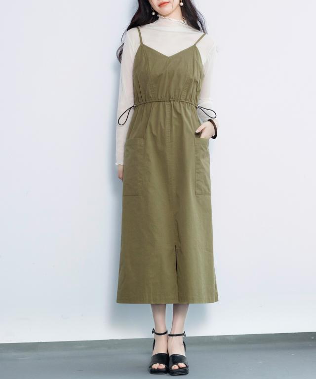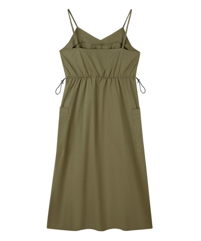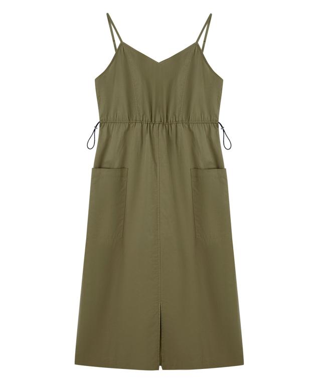 ドロストリボンウエストやカーゴポケットのアウトドアディティールがデザインのポイント。シンプルながらもアクセントが効いたワンピースです。