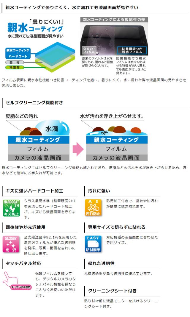 液晶画面を守る「デジカメ用高性能保護フィルム 液晶プロテクター」に、親水コーティングを施した「防水カメラ用」。