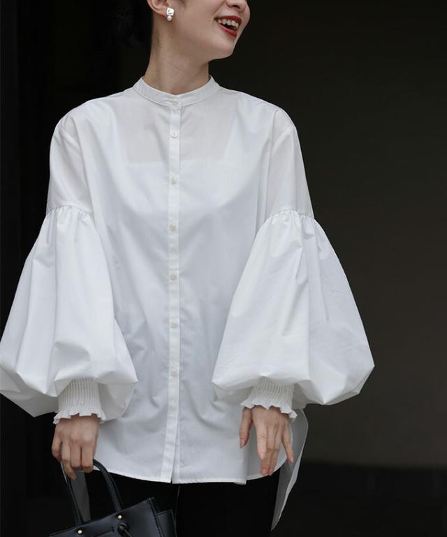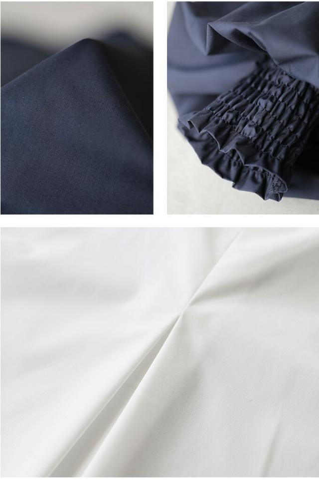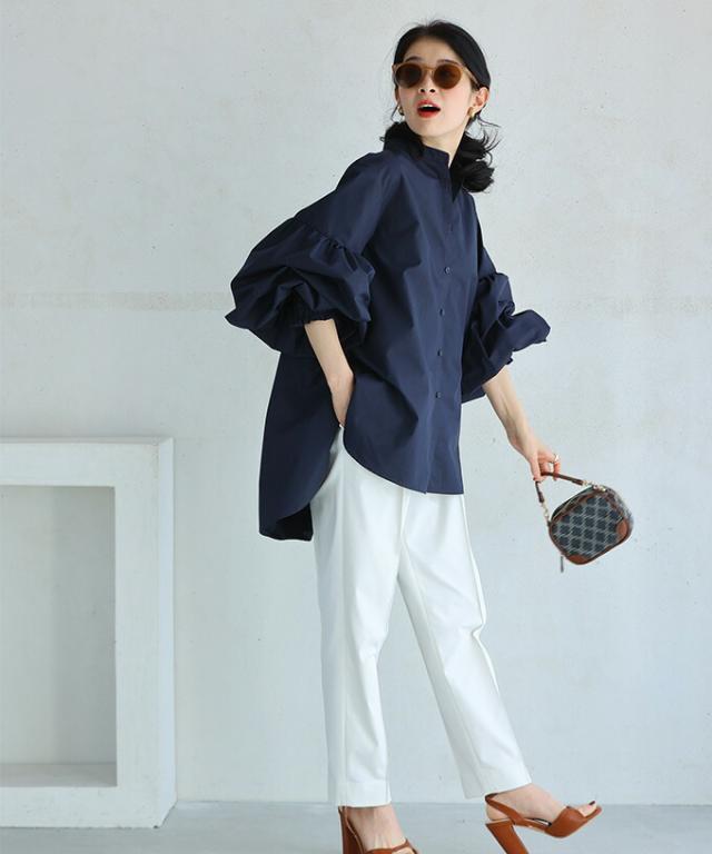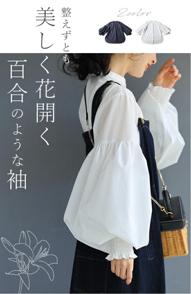 再入荷3月29日 二重構造でふっくら 百合花ポワン cawaii fkm00004 S~L対応 春服 夏服 ホワイト ネイビー ぽわん袖 バルーン袖 体型カバー オシャレ キレイめ 上品 女性らしい レディース ファッション