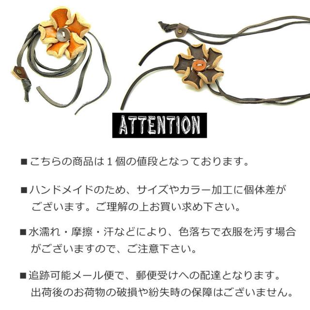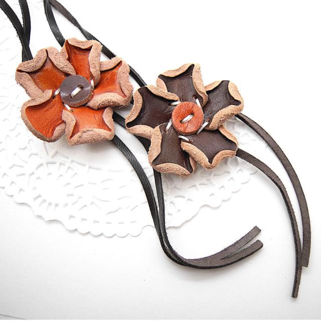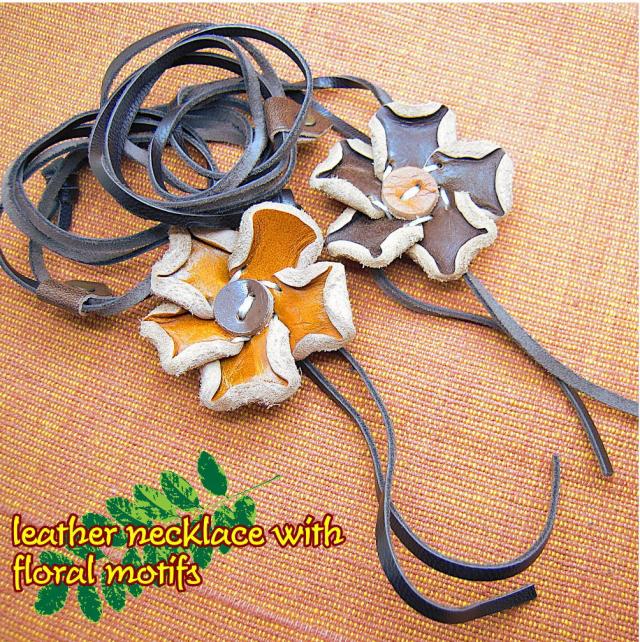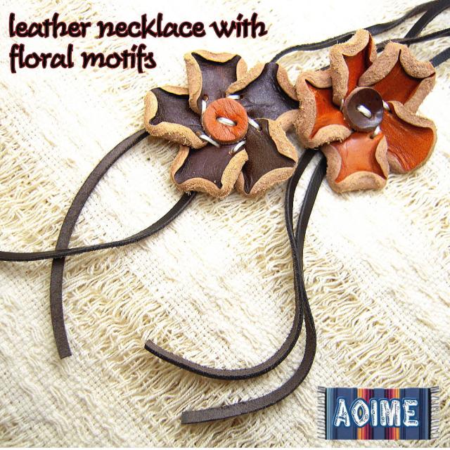ハンドメイドのフラワーネックレスはナチュラルファッションにぴったり。革製品なので可愛くなりすぎず自然な個性が出せそう。長さは簡単に調節できます。