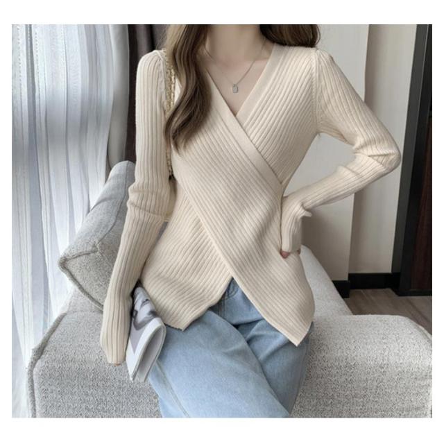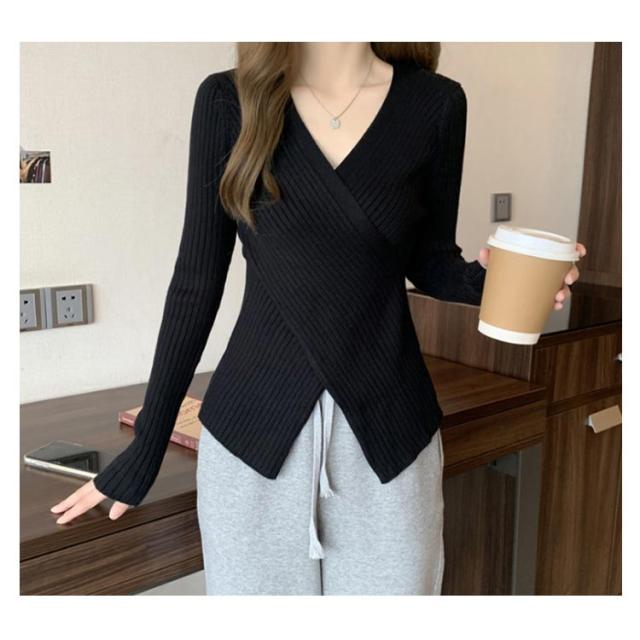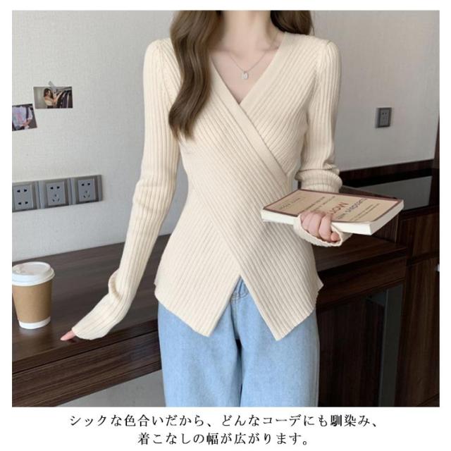 カシュクール Vネック ニットセーター トップス リブ アシメトリーニット コンパクト ニット 春 30代 40代 トップス 秋