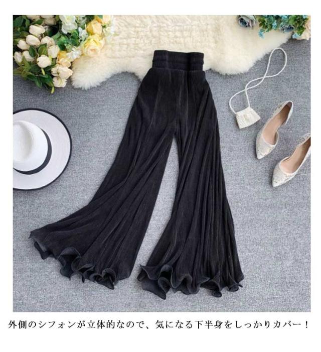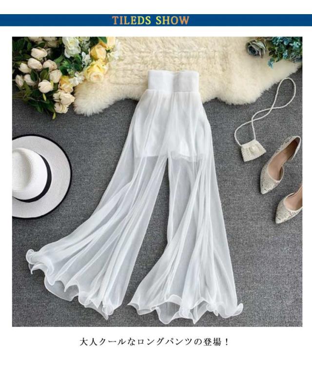 | 2色揃う!思わず目を引く、ふんわり揺れるシフォンがロマンチック! 大人クールなロングパンツの登場! 外側のシフォンが立体的なので、気になる下半身をしっかりカバー! ヒップラインからストンと落ちたキレイなシルエットが脚長効果も◎ 透け感のある素材を重ねたおしゃれなデザインが素敵なスタイルに作り上げる! | |