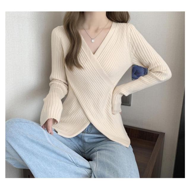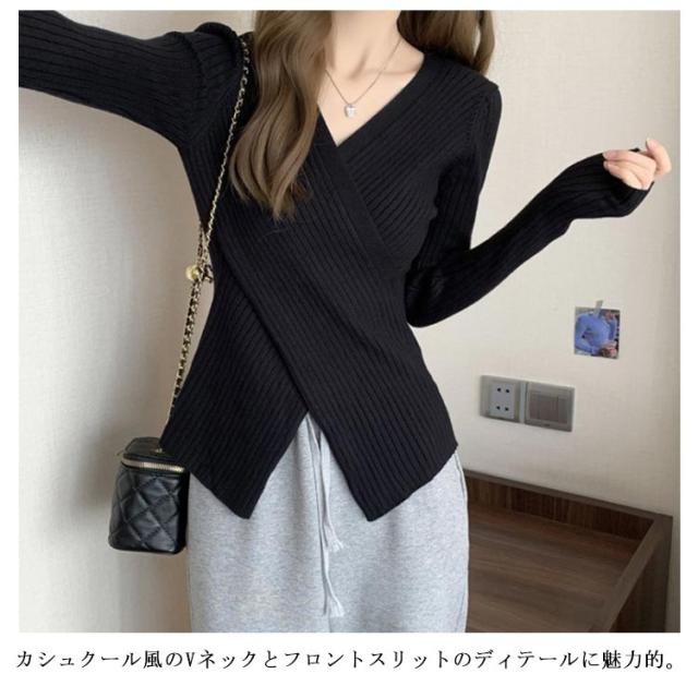 トップス ニットセーター カシュクール リブニット リブ アシメトリーニット Vネック ニット コンパクト 30代 40代 春 秋 冬