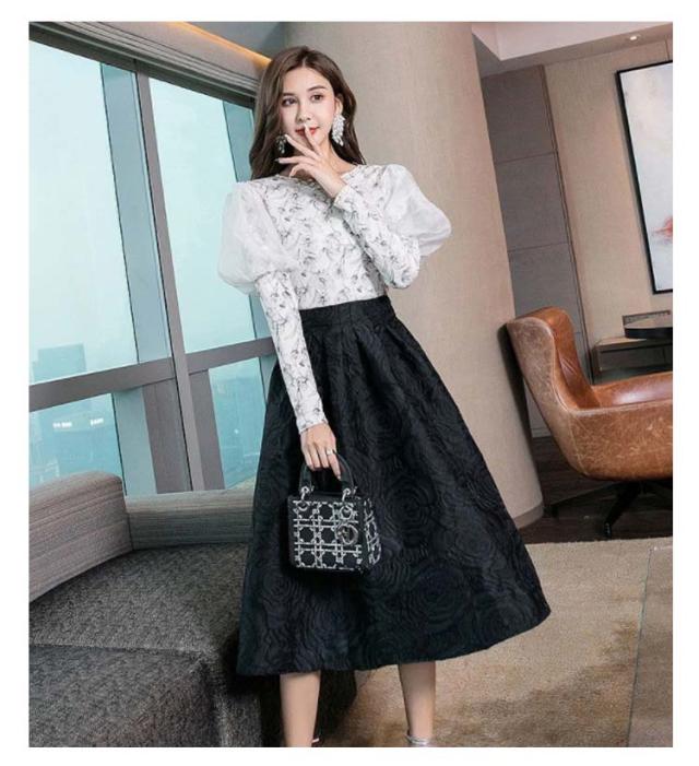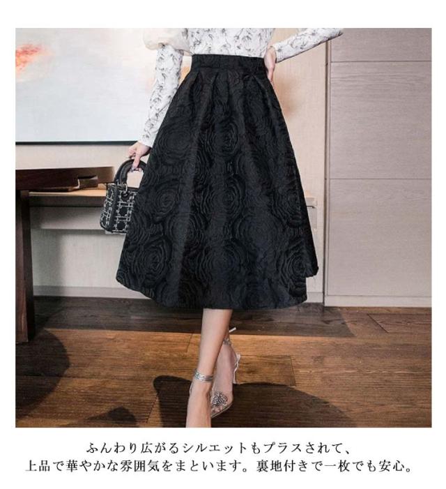レディース ジャガード ロングスカート スカート スタイルアップ ミモレ丈 花柄 ハイウエスト スカート 大人 Aライン フレアシルエット フレアスカート 着回し きれいめ ウエストゴム おしゃれ オフィス 春 秋 冬 上品 カジュアル お出かけ