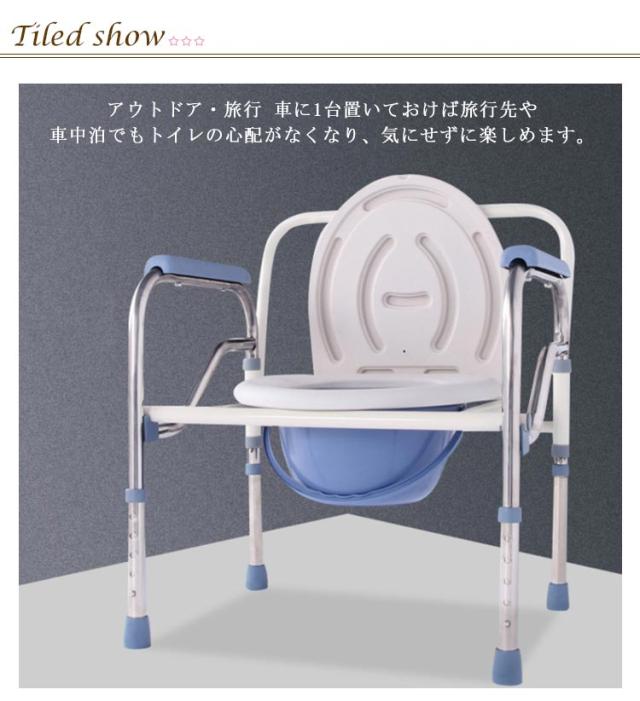 | 椅子一体型トイレ。 折りたためてコンパクトに持ち運びやすい為、手軽にどこでも使える! アウトドア・旅行 車に1台置いておけば旅行先や車中泊でもトイレの心配がなくなり、気にせずに楽しめます。 フレームは軽量かつ丈夫なステンレス仕様です。 立ち座りやすい高さに5段階で調節が可能です。 高さを変えてもしっかりとロックがされるので心配なくご使用いただけます。 耐荷重は約150kgまで耐えられるので安心です。 バケツにはフタが付いているので、ニオイも気にせずに処理することができます。 脚先はゴム製のため滑りにくく、濡れている場所でも転倒防止になります。 | |