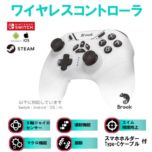 コメント:好評販売中の「Brook ワイヤレスコントローラー ブラック」のホワイトバージョンです。Swith/Android/IOS/PCに対応、3段階の設定可能な「連射ボタン」、マクロ機能・スティック感度調節の「背面ボタン」、6軸ジャイロセンサー、4段階の振動調整機能、「スマホホルダー」「TypeCケーブル」付。650mAhリチウム、連続10〜12時間ゲームプレイ可。220g / L155 x W98 x H60 mm