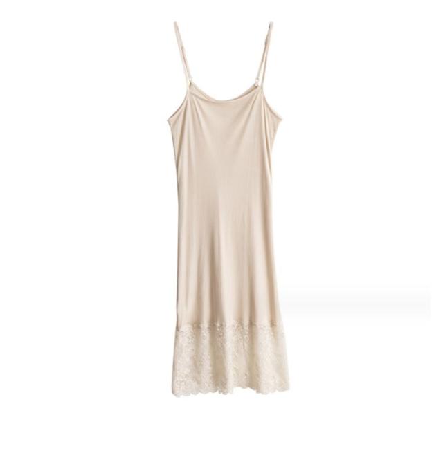 | おしゃれ可愛いレース裾切り替えたキャミワンピースインナー シンプルなデザインだからトップスにひびかず肌着として、透け防止、おしゃれレイヤードなコーデとしてもOK! タイトなシルエットで体にぴったりとフィットして、女性らしいセクシーさもアピール。 滑らかで良く伸びるシルク素材で、冷感あり、静電気軽減ができるスグレモノ♪ サラッと肌滑りも良くロングシーズン(春 夏 秋 冬)快適な着心地。 シンプル無地だからドレスやワンピースのインナーとして大活躍間違いなしです! | |