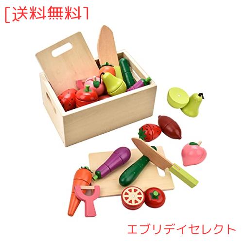 <セット内容>イチゴ、モモ、洋なし、ニンジン、きゅうり、ナス、トマト、サツマイモ、包丁、ピーラー、まな板、収納木箱×各1 <主な材質>木 <トレイサイズ>22cm×15cm×10cm <安全基準>CE(ヨーロッパの安全基準)に認定されたお子様にも安心安全な塗料・染料を使用しています。