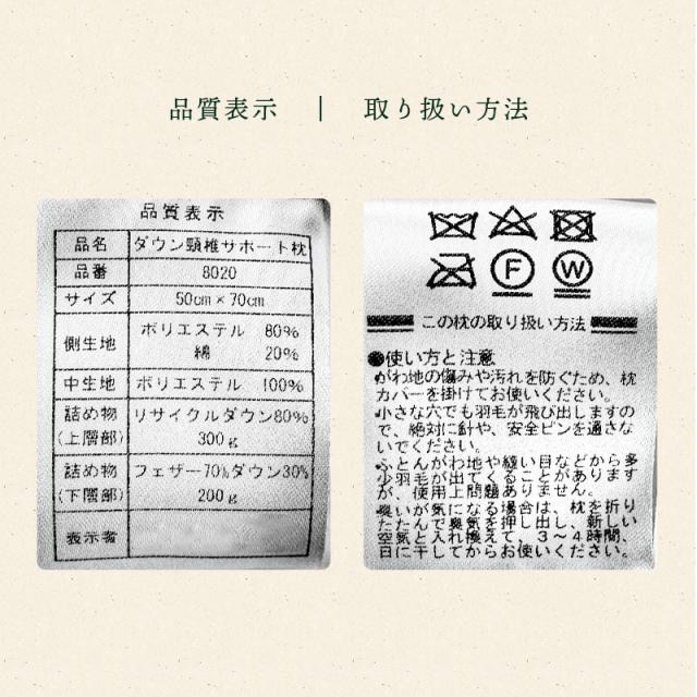 | ・「環」シリーズ 地球温暖化や海洋プラスチック問題など環境問題は年々深刻化し、過去たくさん作ってたくさん捨てる時代には考えもしなかった問題がでてきています。 羽毛は再生可能な資源なのでリサイクルダウンとして再利用できます。 「リサイクル」と聞くと清潔ではないのではないかと感じられるかもしれません。しかし、新毛よりもリサイクルダウンの方が、洗浄の回数が多く、清潔で臭いの少ないダウンに仕上がります。 ・国内の自社工場で製造しています。お客様に安心していただける商品をお届けするため、ダウンピローの中材となるダウンの充填から側生地の縫製、梱包・出荷まで当店のスタッフが手作業で行っています。 ・ふっくらダウン85%洗浄した清潔なリサイクルダウンを使用。ダウン85%のふっくらとした弾力は、頭や頸椎に負担をかけず、自然な寝心地が得られます。 ・リサイクルダウン&フェザーの2層式上層部にはリサイクルダウンをたっぷり85%使用、下層部はフェザー70%使用し、へたりにくく耐久性をUP。また羽毛が頭部を優しく包み込み、底付き感もありません。 ・首を優しく支える「頸椎支持構造」頸椎部分をふっくらとさせるキルト加工を施し、羽毛の移動を防止します。ダウンの量を一定にすることで、寝返りをうっても頭や頸椎を安定させ、心地よい寝姿勢を維持しやすくなりました。 | |