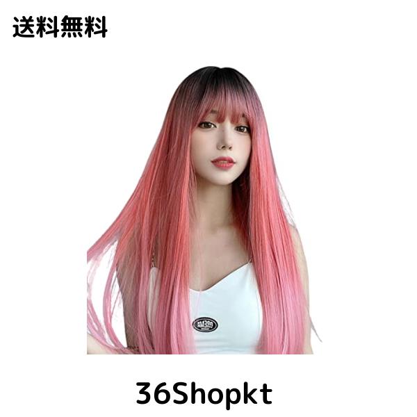 Vigorousウィッグ ロング ストレート ピンク 黒 グラデーション ブラック ウェーブ カール ぱっつん前髪 ナチュラル フルウィッグ カツラ
