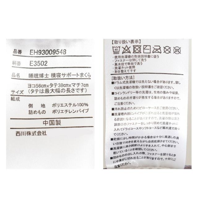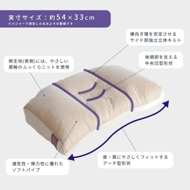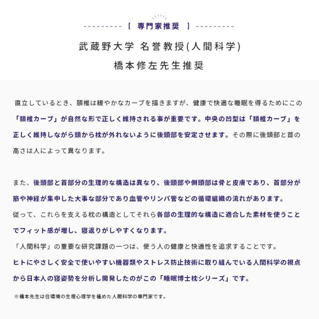 | ・気持ちよく横向き寝をしたい方へ 西川×人間科学の専門家 共同開発の人間科学から生まれた快眠健康枕シリーズから横向き寝にやさしいまくらが登場。女性の約6割が横向きで入眠するといわれています。 横寝サポートは、就寝時に必要な高さをキープさせるために横寝エリアを独立させています。それにより横寝の高さが安定し、横向き寝がしやすくなっています。 ・横向き寝にやさしい肩幅を考慮し、枕の高さをやや高めにしているため、横向きに寝た時の寝姿勢が安定します。 ・首にやさしい仰向け時に中央凹型形状が首・後頭部を支え安定します。 ・肩にやさしい肩口にしっかりフィットする大きめなアーチ型形状。 ・ふっくらやさしいニット生地表面は伸びのよい、ふっくらとやわらかなニット生地を使用しています。 ・通気性に優れたソフトパイプ通気性・弾力性に優れたソフトパイプが入っています。 高さ調節可能な補充パック付きです。 ・横向き寝がしやすいキルティング後頭部は凹型形状で頭部のS字ラインをしっかりとキープ。 そのサイド部の独立立体キルトにより横向き寝用のスペースが作られているので、安定して横向き寝をすることができます。 ・横寝時の隙間を埋めるアーチ型形状肩口は首・肩にやさしくフィットするアーチ型形状です。 横寝時の首の隙間を埋めてくれます。 ・3か所の調節口から高さ調節可能首と後頭部の3か所の調節口からパイプを出し入れすることで、中心部と両サイドのそれぞれで高さ調節が可能です。 ・武蔵野大学 名誉教授(人間科学) 橋本修左先生推奨直立しているとき、頚椎は緩やかなカーブを描きますが、健康で快適な睡眠を得るためにこの「頚椎カーブ」が自然な形で正しく維持される事が重要です。中央の凹型は「頚椎カーブ」を正しく維持しながら頭から枕が外れないように後頭部を安定させます。その際に後頭部と首の高さは人によって異なります。 また、後頭部と首部分の生理的な構造は異なり、後頭部や側頭部は骨と皮膚であり、首部分が筋や神経が集中した大事な部分であり血管やリンパ管などの循環組織の流れがあります。 従って、これらを支える枕の構造としてそれら各部の生理的な構造に適合した素材を使うことでフィット感が増し、寝返りがしやすくなります。 「人間科学」の重要な研究課題の一つは、使う人の健康と快適性を追求することです。 ヒトにやさしく安全で使いやすい機器類やストレス防止技術に取り組んでいる人間科学の視点から日本人の寝姿勢を分析し開発したのがこの「睡眠博士枕シリーズ」です。 ※橋本先生は住環境の生理心理学を極めた人間科学の専門家です。 | |
