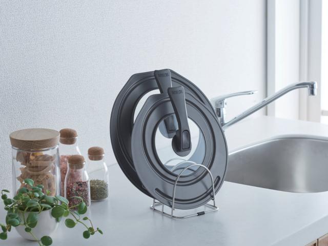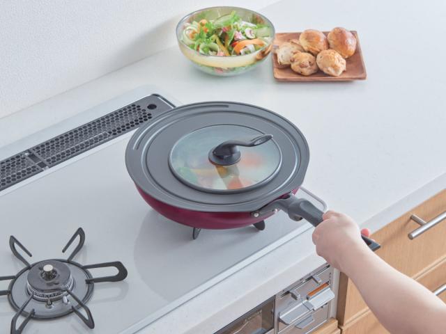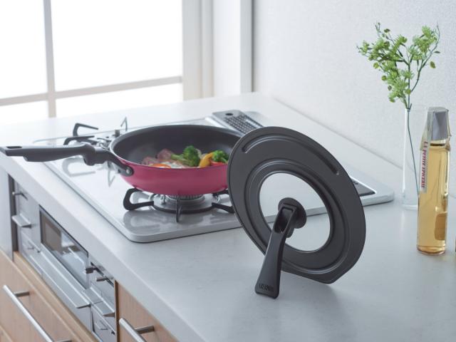 取っ手がそのままスタンドとして使える、自立タイプのフライパン蓋です。調理中もサッと立てて置けるので狭いキッチンでも邪魔になりません。