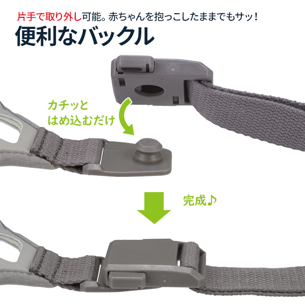 便利なバックルつき片手で取り外し可能なバックル。赤ちゃんを抱っこしたままでも、サッとマザーズバッグやベビーカーから取り外せます。