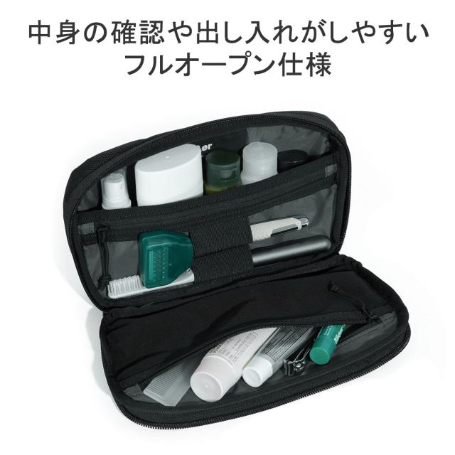 アメニティグッズの快適な持ち運びのためにデザインされた自立型のポーチ。歯ブラシやカミソリ等の収納に便利なループの他、複数のポケットを設けています。内装には汚れても手軽に拭き取れる耐水・抗菌加工の施された素材を採用し、収納口は止水ファスナー仕様とアメニティグッズを持ち運ぶのに嬉しい安心設計が魅力です。