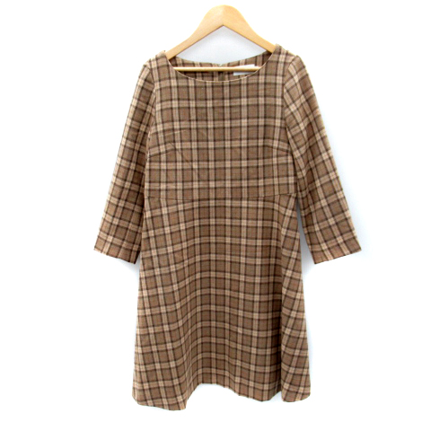【中古】ボンメルスリー ワンピース ひざ丈 長袖 ラウンドネック チェック柄 36 ウール ベージュ /SY12 レディース