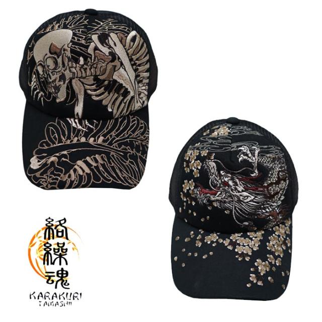 絡繰魂から新作和柄キャップが登場!!総刺繍の龍柄とがしゃどくろ柄2色展開のメッシュキャップです。