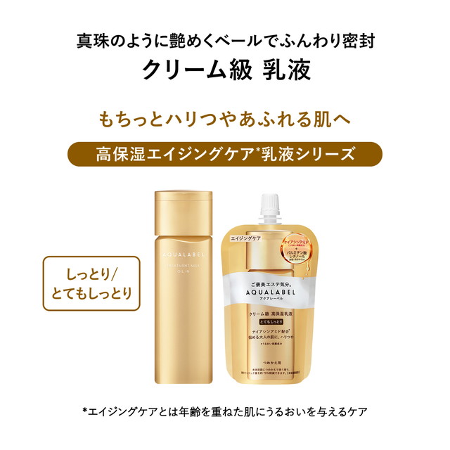◇トリートメントミルク (オイルイン) とてもしっとり (つめかえ用)は、アクアレーベル トリートメントミルク (オイルイン) とてもしっとり の本体容器につめかえてから、ご使用ください。
