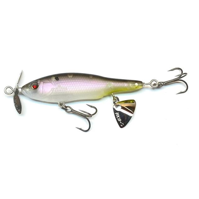 ボディー腹部に装着されたブレードが運動源になり、プロップベイトでありながら ロールアクションを発生させながら泳ぎます。(その際に金属音も発生)