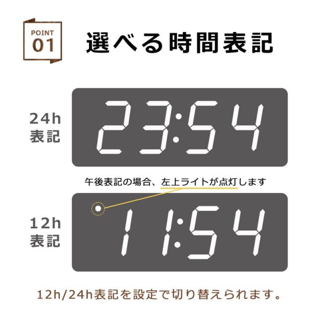 時計表示の12時間/24時間の切替や日付・温度の表示、アラーム機能も搭載。