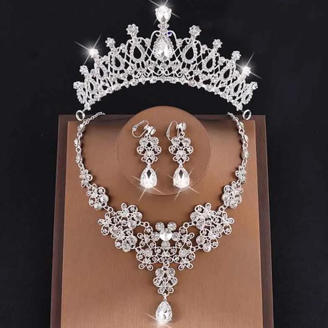 高級感のあるクリスタルのビジューネックレスとイヤリング1ペアとティアラのような王冠のセットです。