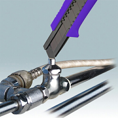 | 切断、折り目付け、マイナスドライバーペンキ管などの蓋開け。エンドのフィンで突く・回す・抉るなどのが自在です。手にフィットする新設計ABSグリップです。安全ロープを取付けが可能な穴が付いています。ホルダーは総焼入れ仕様です。 |