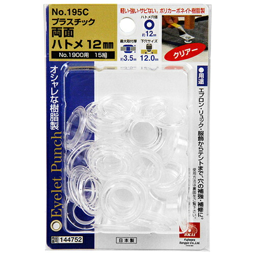 | ●ハトメ穴径:約12mm。●最大取付厚:約3.5mm。●下穴サイズ:12.0mm。●入数:15組入。●適合機種:SK11プラスチック両面ハトメパンチ(No.1900)。●色:クリアー。 |