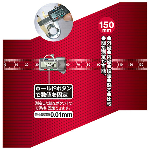 | ●電池:ボタン電池(SR44)1個(モニター用電池付属)。●測定範囲:0.01〜150mm・最小読取値:0.01mm・精度:±0.03mm。●使用適応温度:5〜40度。●プラスチック製収納ケース付き。 |