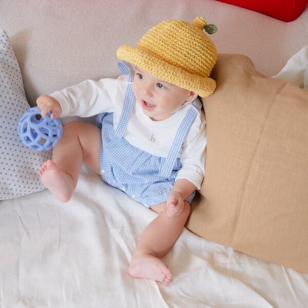 フルーツモチーフのフォルムとトップのとんがり+葉っぱデザインがとってもCUTEなハット。落下を防止してくれるゴム紐付きも、うれしいポイント。