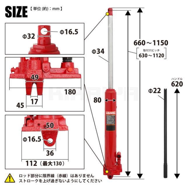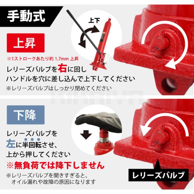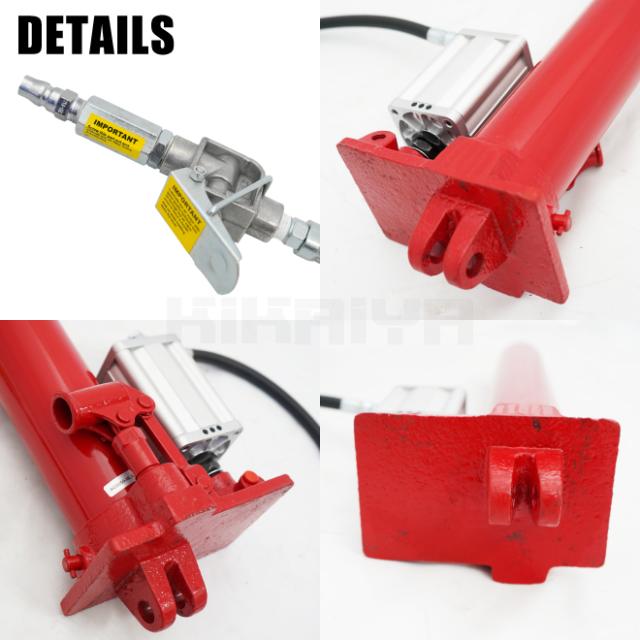 ●アルミ製エアーポンプで錆に強い、油圧工具の交換用シリンダーです ●エアー手動兼用式で効率UP!どちらでもお使いいただけます ●横向きでの使用は出来ません ●ロングラムなので約490mmの長いストローク ●エアー式は、エアーコンプレッサーに繋いでバルブを握るだけ ●約2分で最大まで上昇します(約1トン負荷時) ●手動式での1ストロークあたりの上昇量は約1.7mmで調整用に最適です ●下降はレリーズバルブを左に半回転し、上から押してください (無負荷では下降しません) ●ジャッキの中にはオイルが入っておりますので、開封後すぐにご使用いただけます ●エアーでお使いいただく場合、エアーコンプレッサーが必要になります ※荷重支持用ではありません ※ジャッキアップ後は、ジャッキスタンド等を使用して荷重を速やかに サポートしてください ※耐荷重を超えて過負荷をかけないでください ★別途販売している「KIKAIYA エンジンクレーン 2トン (EC-2)」の グレードUP用油圧シリンダーとして使用する事が可能です |