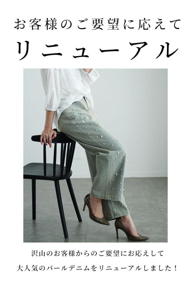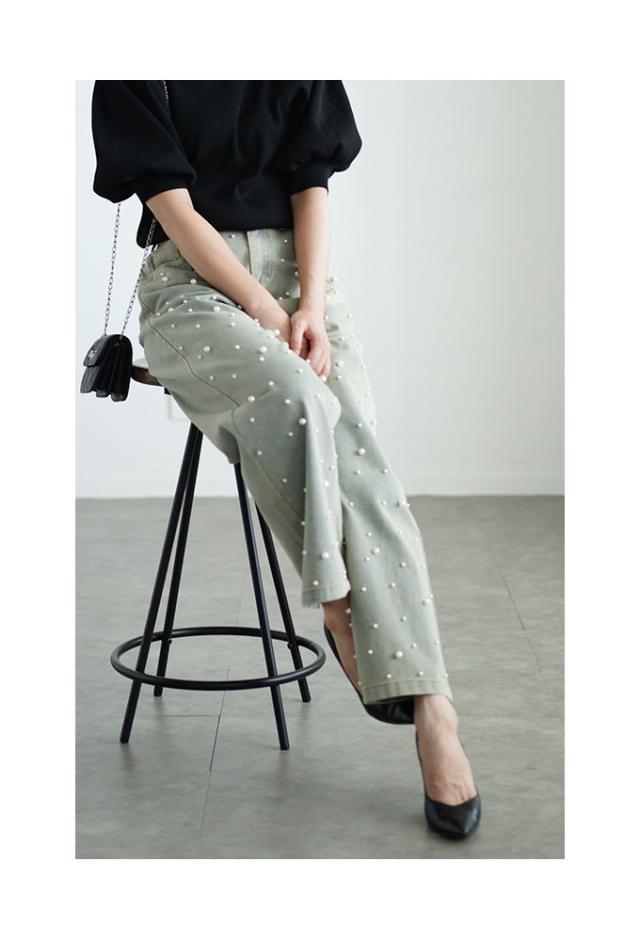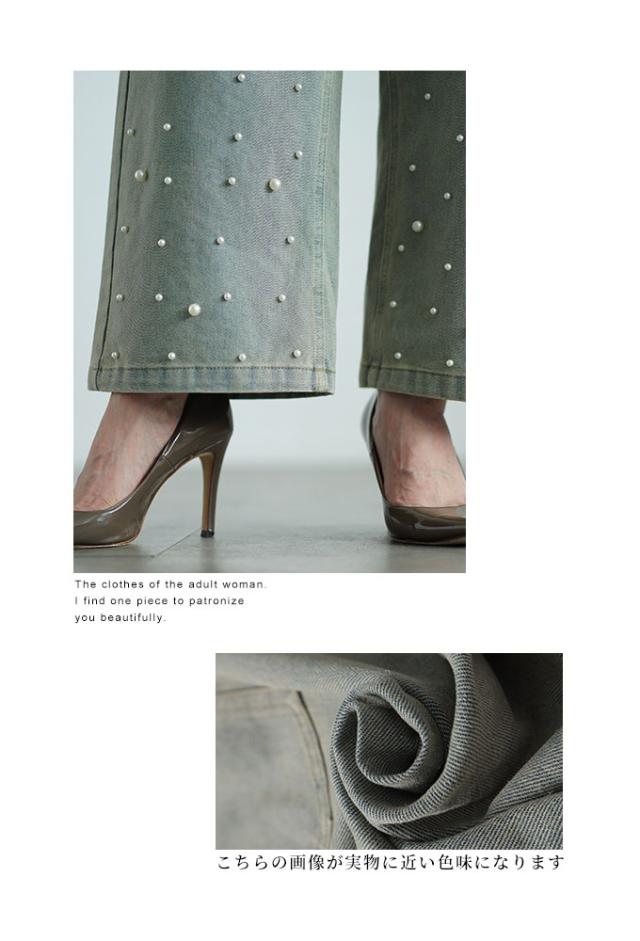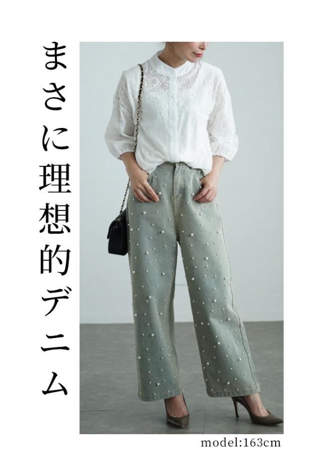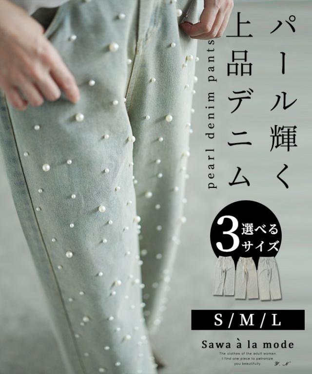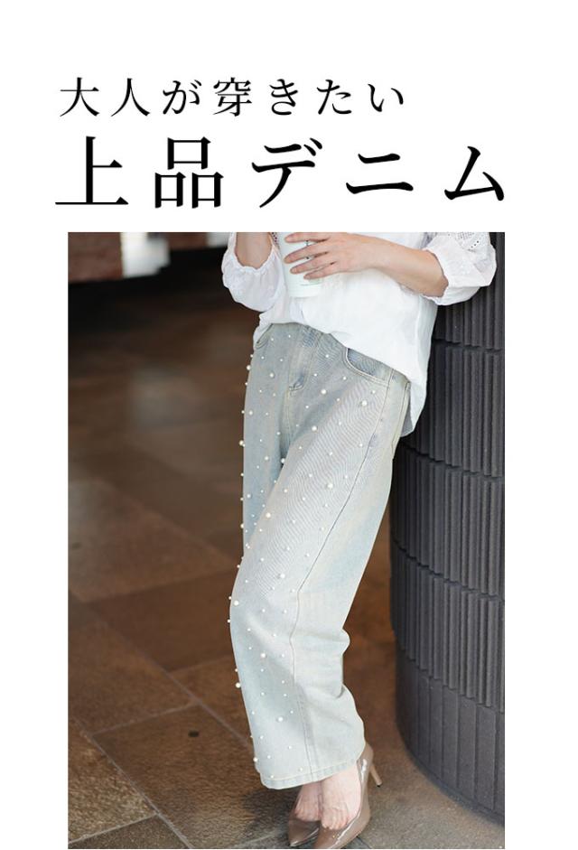 冬新作 艶めくパールを散りばめたハイウエストデニムパンツ レディース ファッション ボトムス パンツ ライトブルー ロング丈 冬 大人可愛い S M L40代 レディースファッション 50代女性 ファッション 60代 ミセスファッション サワアラモード sawaalamode otona mode-9321